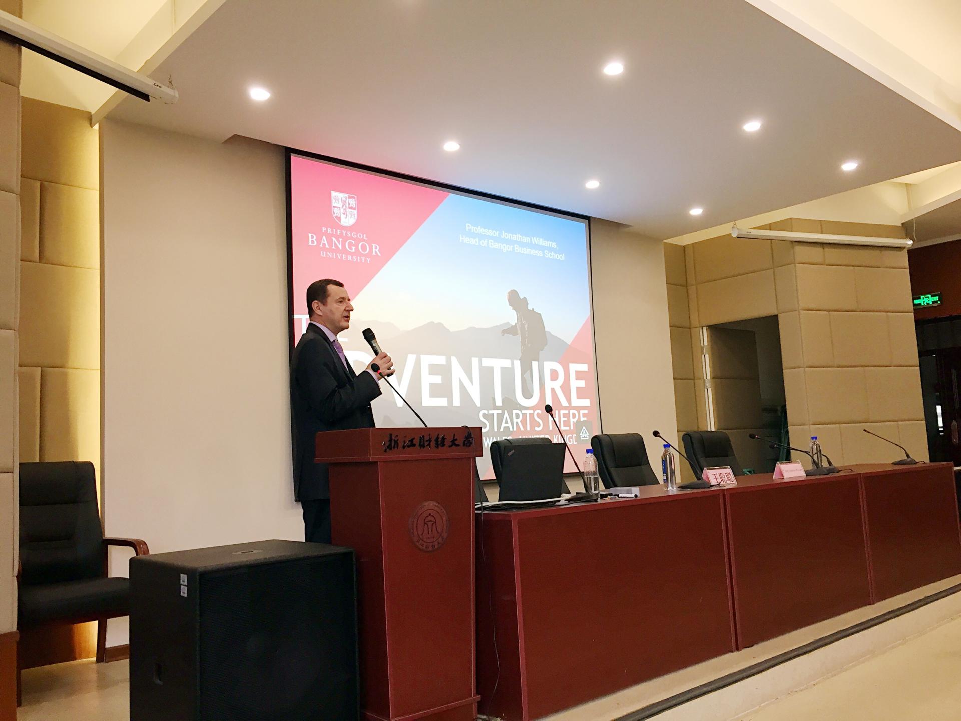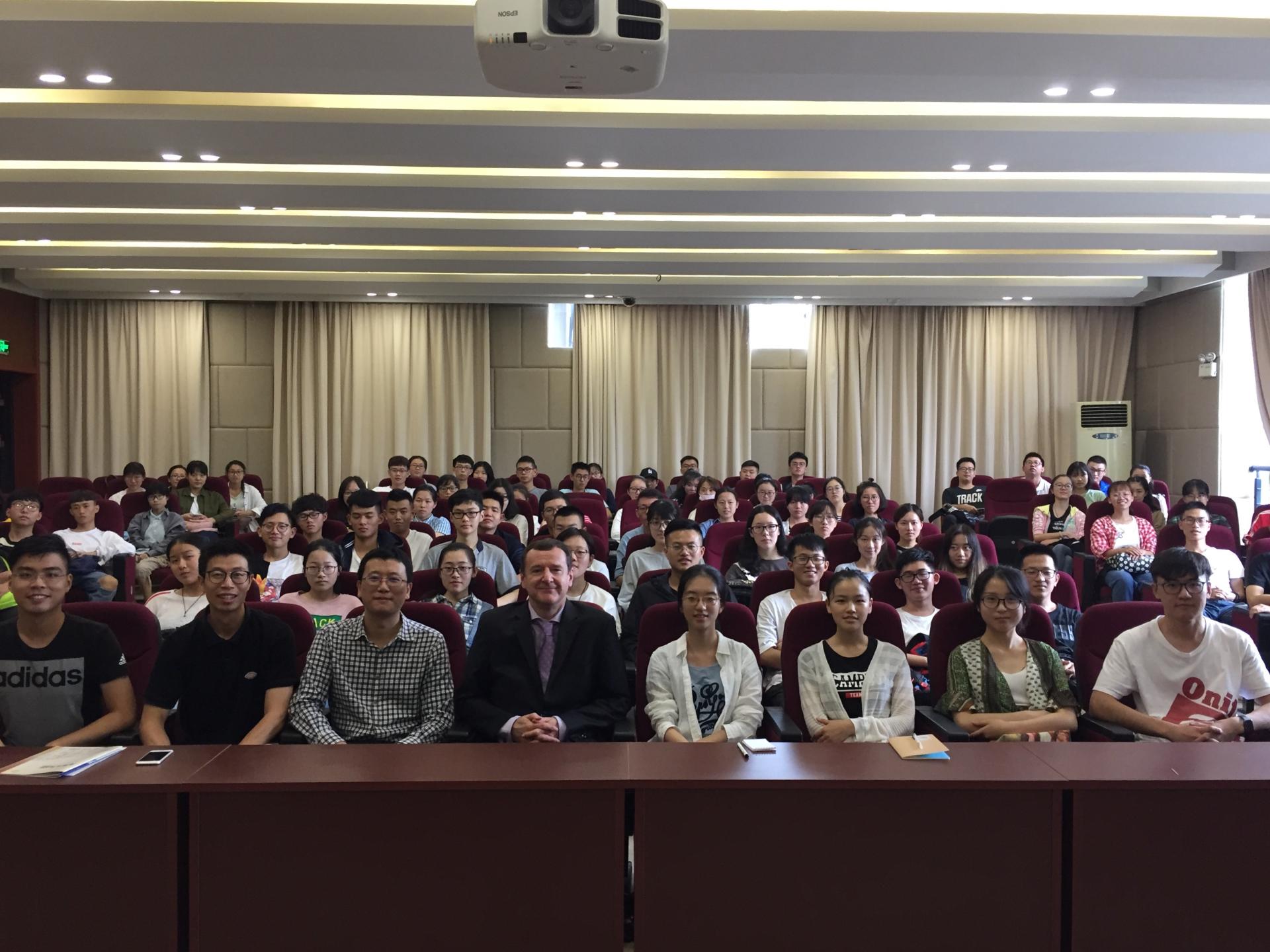 Jonathan Williams教授细致又不乏幽默地为新生们介绍了班戈大学悠久的历史、国际化的教学环境、美丽的风光,接着教授阐述了台湾av 与英国班戈大学合作办学项目对于中英金融学专业学生在国际化、专业化的重大意义。最后,新生们与教授进行了详细的交流。