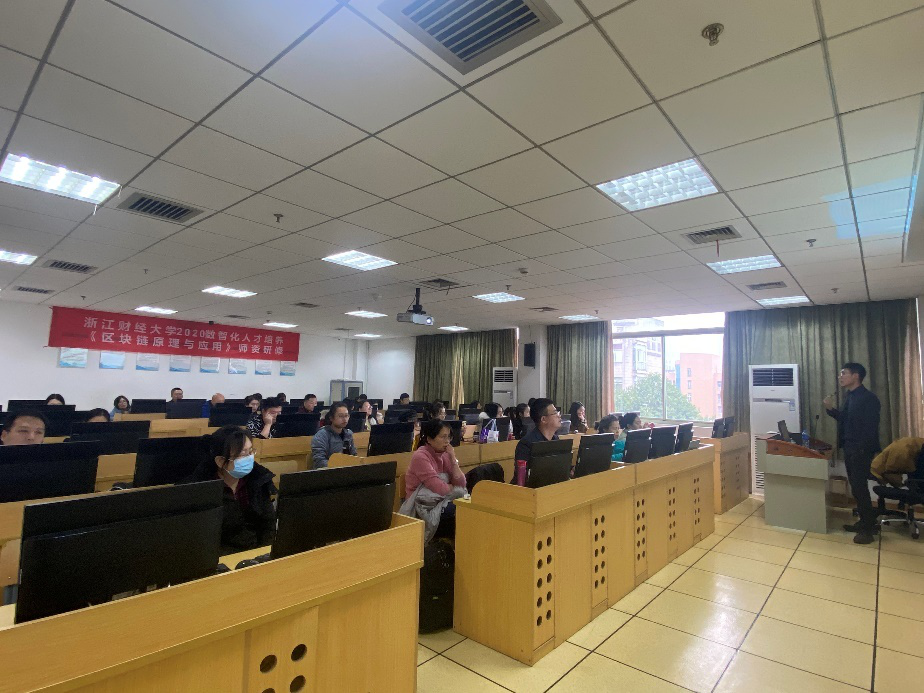 金融系主任金骋路老师,代表承办方与在座参加师资训的老师们,介绍了浙财大金融专业的发展方向以及在数字经济时代区块链人才培养方面的思考。
